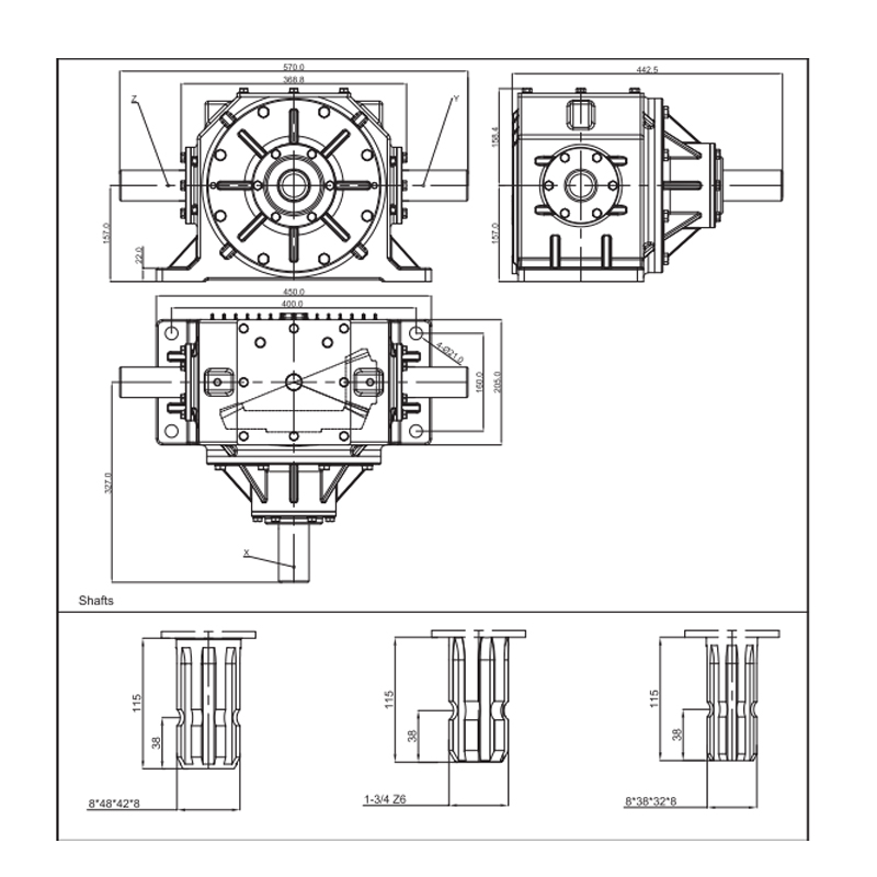 กล่องเกียร์อินพุตพลังงานผ่านกล่องแนวตั้งด้านหน้าของเครื่องหรือรถแทรกเตอร์เพิ่มความเร็วในการหมุนและส่งพลังงานไปยังเพลาคัตเตอร์บดผ่านเพลาส่งและสายพาน ผ่านเอาต์พุตสองด้านความกว้างการทำงานของเครื่องสามารถถึง 3.5 เมตรถึง 6.5 เมตร ในขณะเดียวกันก็สามารถตระหนักถึงฟังก์ชั่นการบดรองเพื่อให้ได้ผลการบดที่ดีขึ้นในพืช เครื่องบดฟางพืชแล้วรีไซเคิลแพ็คและนำกลับมาใช้ใหม่หรือส่งคืนไปยังมาตรฐานฟีดโดยตรงหรือส่งคืนโดยตรงไปยังสนามเพื่อเน่าเพื่อเพิ่มความอุดมสมบูรณ์ของที่ดิน กระปุกเกียร์ประเภทนี้จะใช้ในอุปกรณ์บดของอุปกรณ์ต่าง ๆ เช่นจตุรัสจตุรัสขนาดเล็ก, บัลเล่ต์สี่เหลี่ยมจัตุรัสขนาดเล็ก, บัลเลอร์กลม, เครื่องกลับฟาง, ฯลฯ